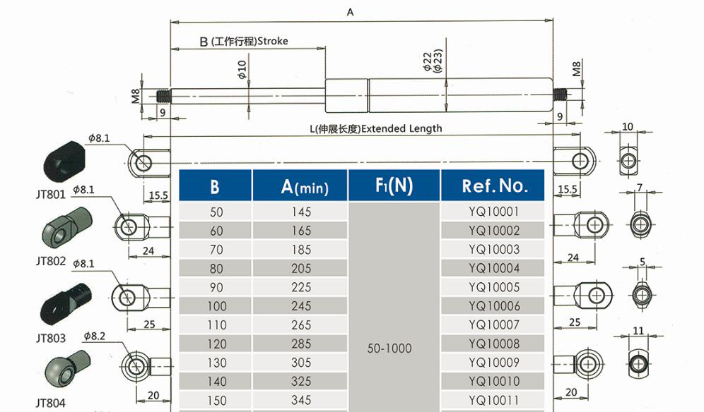注:由于氣彈簧是非標(biāo)準(zhǔn)的,以上僅為型號(hào)的一部分。我們可以根據(jù)客戶的要求定制。