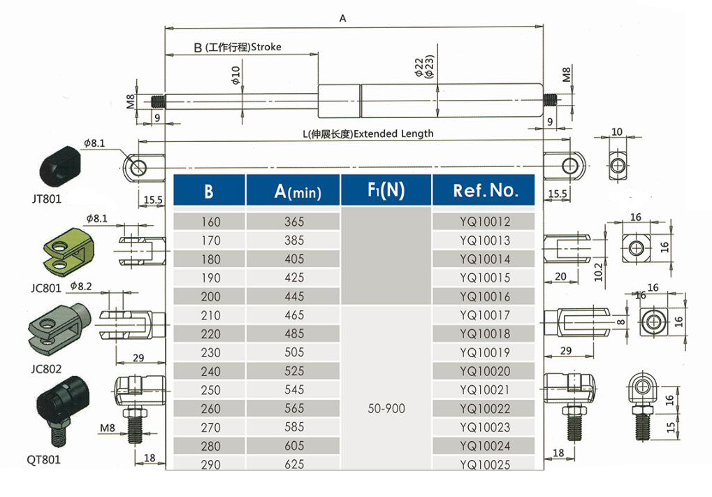 注:由于氣彈簧是非標(biāo)準(zhǔn)的,以上僅為型號(hào)的一部分。我們可以根據(jù)客戶的要求定制。